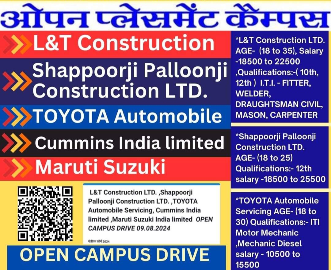 Maruti Suzuki & 04 Other Company’s Campus Placement 2024 | 10th / 12th / ITI / Diploma Pass | July 2024 Company’s Name –  L&T Construction LTD Shappoorji Palloonji Construction LTD  TOYOTA Automobile Servicing Cummins India limited  Maruti Suzuki India limited  Qualification / Salary – Cummins India limited Age – (18 to 30) Qualifications :- … Read more