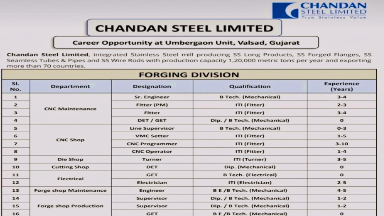 Chandan Steel Recruitment 2024 | Electrician, Operator, DET, GET & Others | ITI/Diploma/Degree | July 2024 |