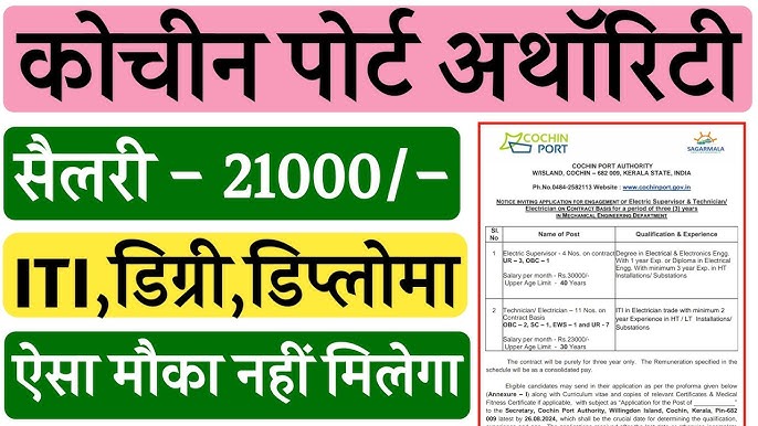 Cochin Port Authority Recruitment 2024 | Technician/Electrician, Electric Supervisor | 15 Posts | ITI/Diploma /Degree | Last Date: 26 August 2024 |