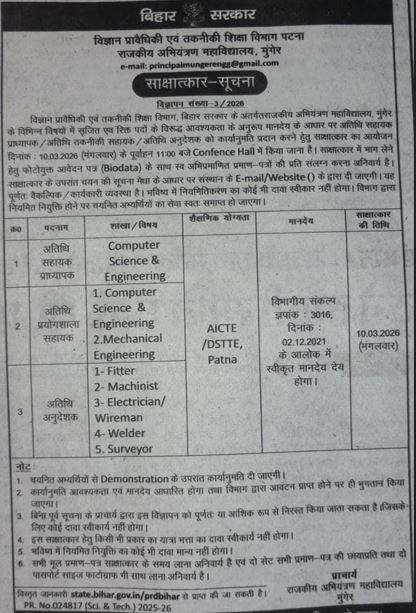 राजकीय अभियंत्रण महाविद्यालय, मुंगेर भर्ती 2026