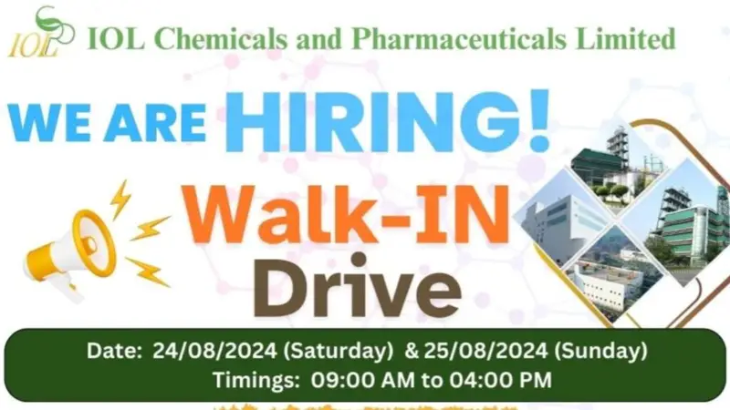 IOL Chemicals and Pharmaceuticals Walk In Interview 2024 | Technician, Engineer & Others | ITI/Diploma/BE/ B.Tech | August 2024 |
