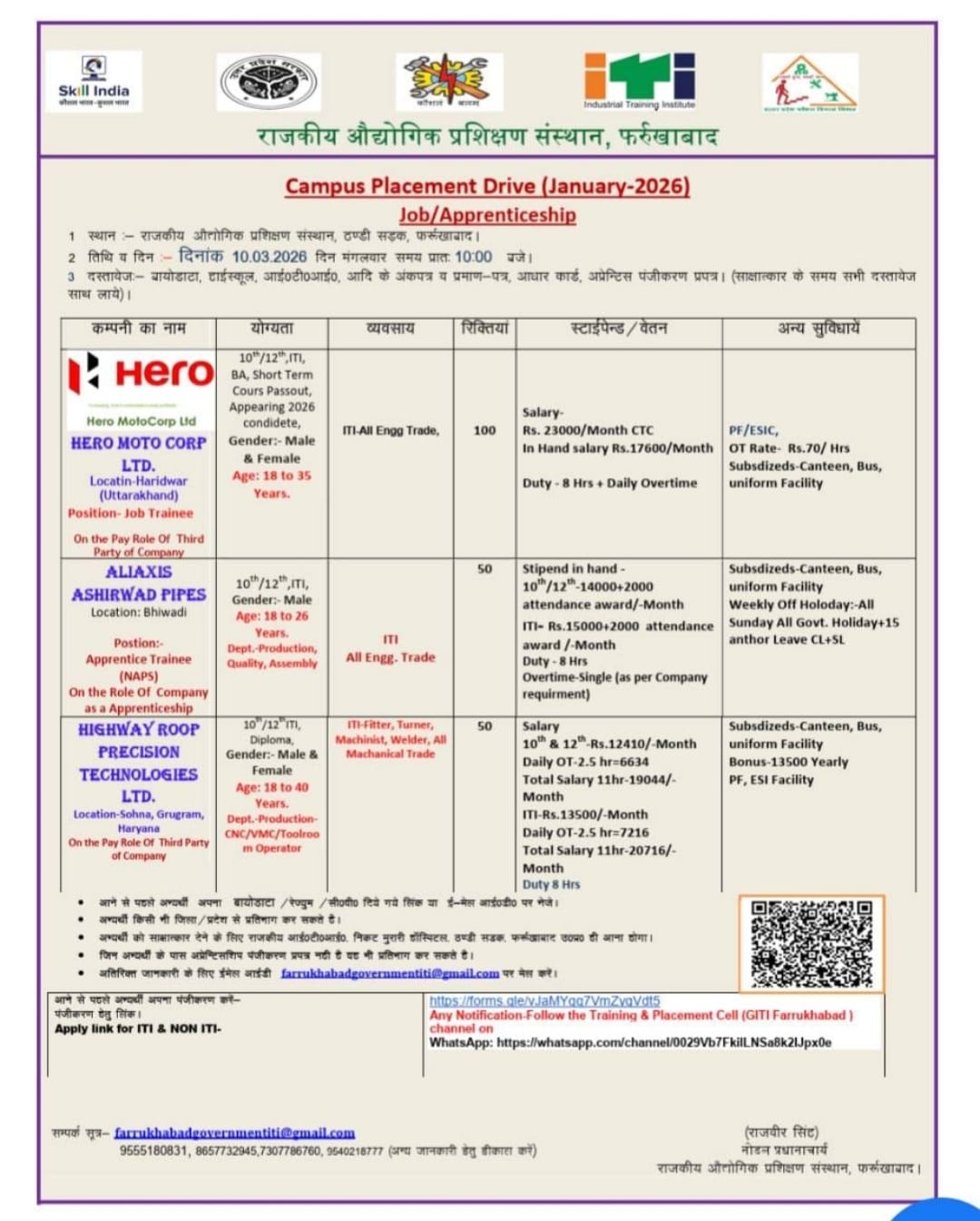 ITI Hero MotoCorp Ltd, Aliaxis Ashirwad Pipes And Highway Roop Precision Campus Placement 2026: यह राजकीय औद्योगिक प्रशिक्षण संस्थान (ITI), फर्रुखाबाद द्वारा आयोजित होने वाले Hero MotoCorp Ltd, Aliaxis Ashirwad Pipes And Highway Roop Precision कैंपस प्लेसमेंट ड्राइव की विस्तृत जानकारी है। यह उन युवाओं के लिए एक सुनहरा अवसर है जो नामी कंपनियों में नौकरी या अप्रेंटिसशिप (Apprenticeship) तलाश रहे हैं।