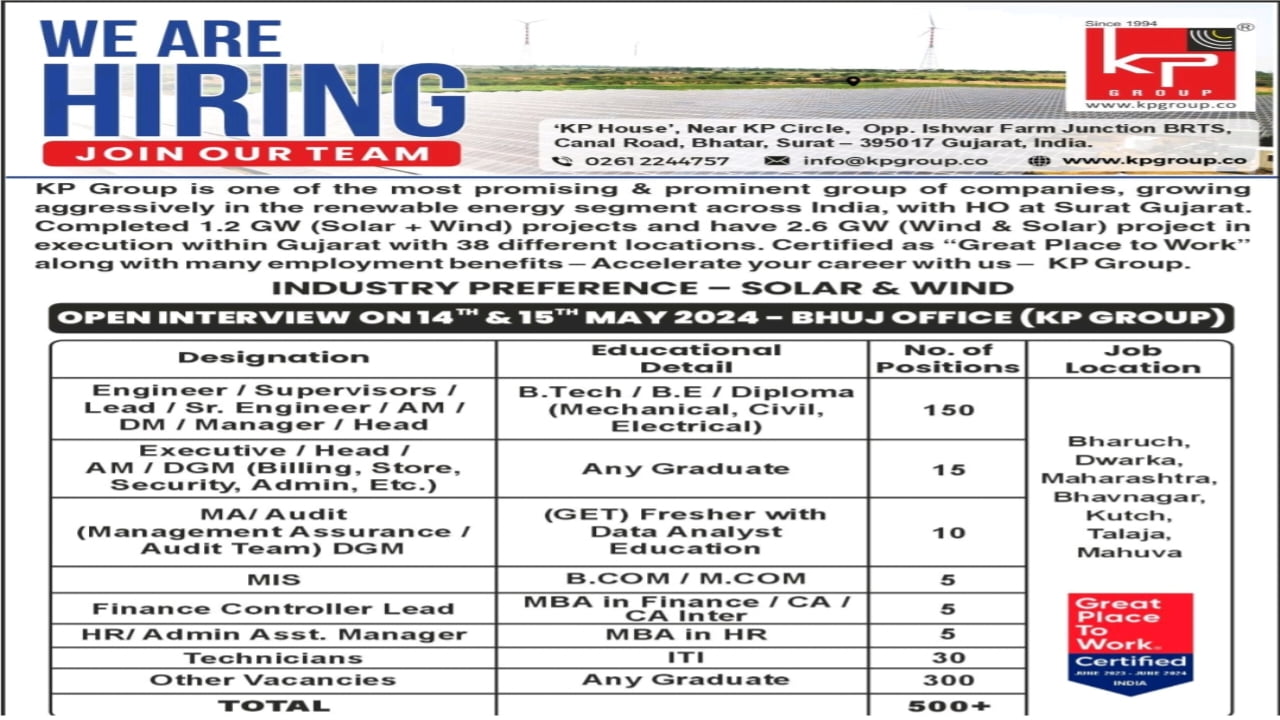 इस वॉक इन इंटरव्यू मै के पी ग्रुप की तरफ से टेक्नीशियन, इंजीनियर, सुपरवाइजर तथा अन्य पदो पर 500 से ज्यादा आईटीआई/डिप्लोमा/ग्रेजुएट पास उम्मीदवारो की भर्ती की जाएगी। जो की निम्न प्रकार से है: