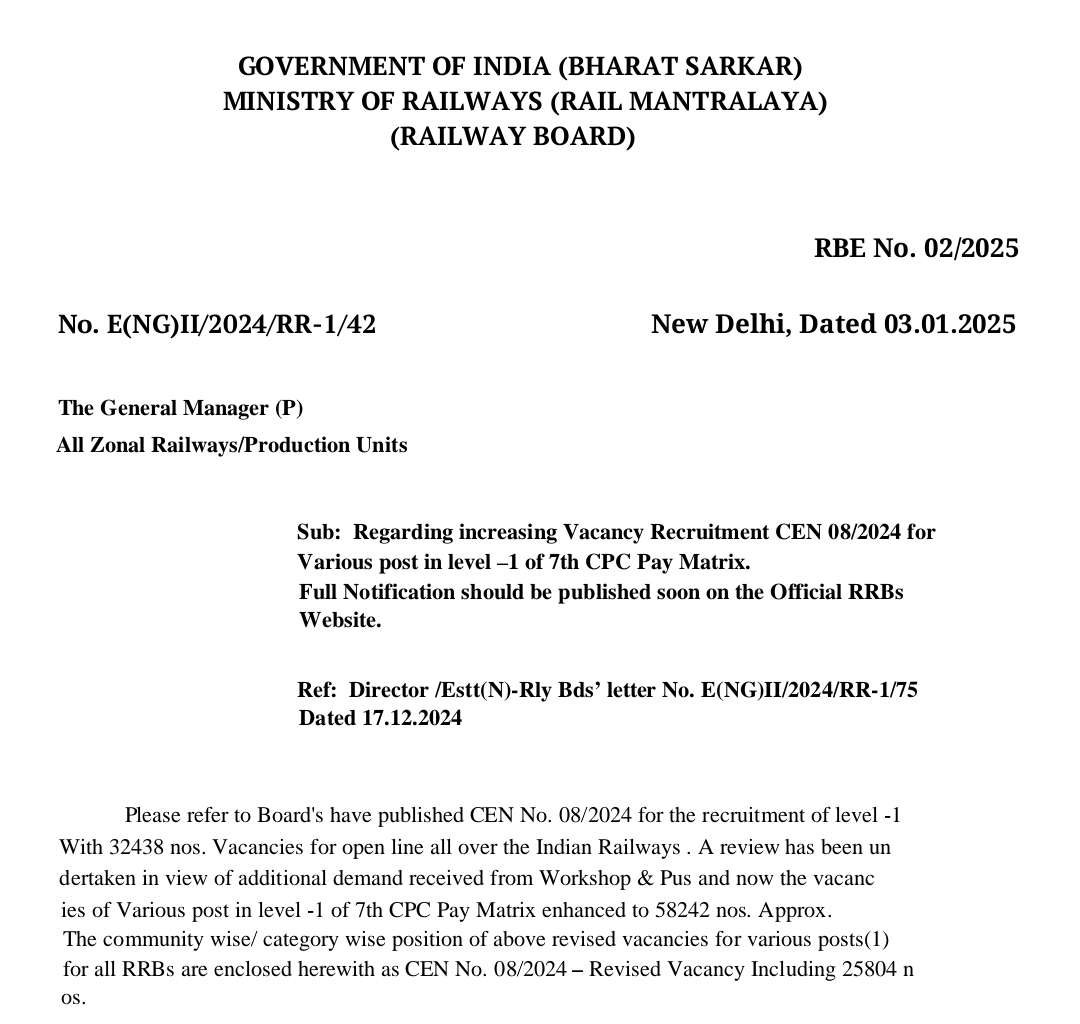 Railway Group D Vacancy 2025 Increase 58242 Posts